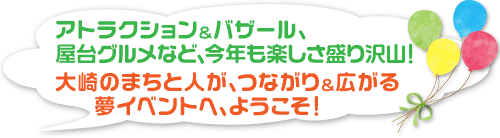 人と、まちと、地域の企業etc.が一つに解ける3日間。大崎のまちを彩る“秋の一大叙事詩”お待ちかね「しながわ夢さん橋」が今年もやってきました!ーーー地元の人々はもちろん、地域のお店や企業、地方の生産者の方々がつながり、盛り上げてきた伝統の「夢さん橋」。昨年の開催で30回目を越えたこの秋は、多くの人々のサポートパワーでさらに充実。皆様のご期待に応えた豊かな“つながり”のおもてなしを揃えてお待ちしています。